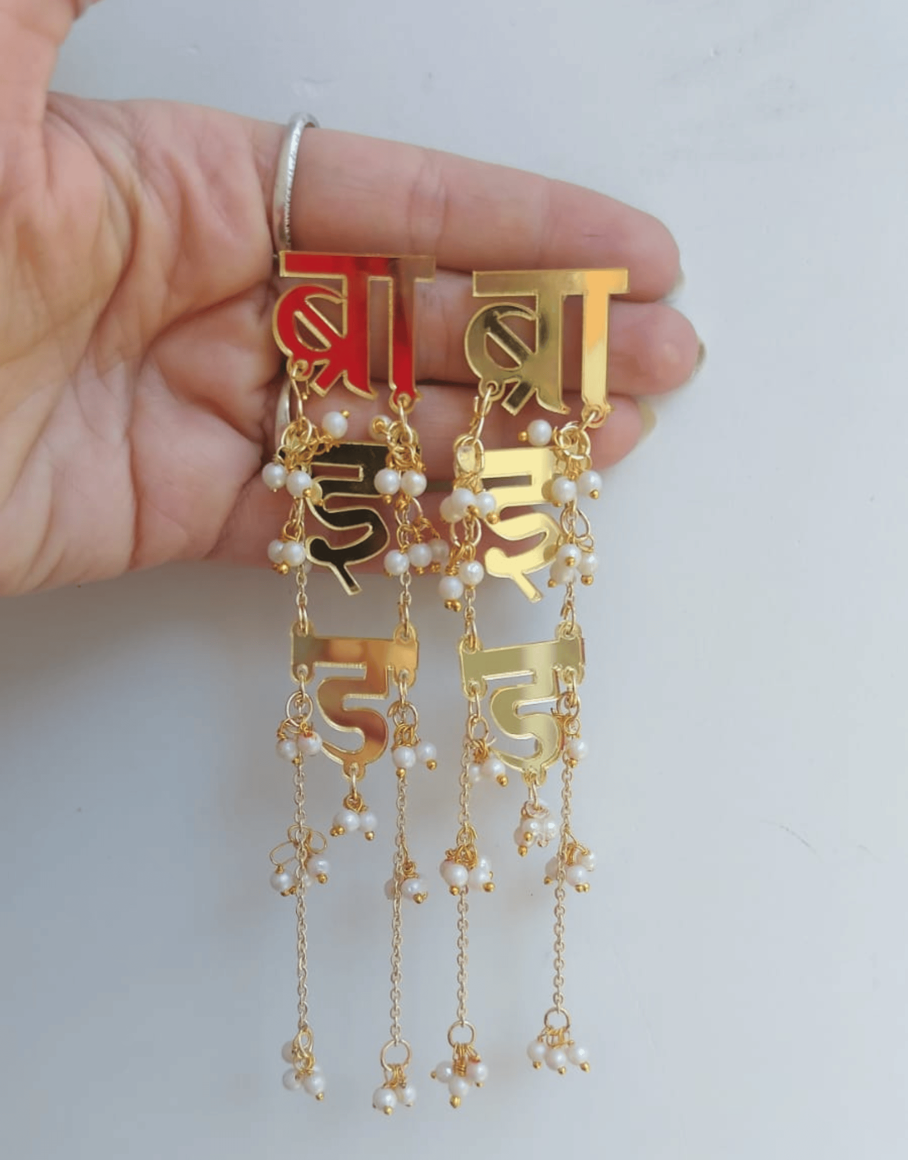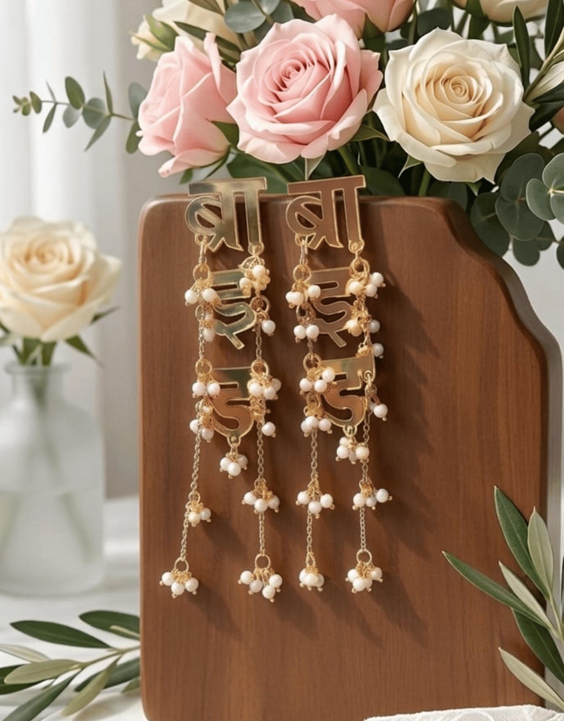 Make your bridal look even more stunning with these elegant Bridal Acrylic Earrings. Designed with beautiful lettering and delicate pearl chain drops, these earrings create a graceful and royal statement perfect for brides. The golden acrylic finish paired with pearl detailing adds a luxurious touch that beautifully complements bridal outfits.